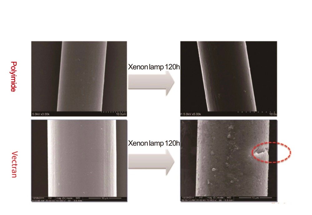 Under the electron microscope (with a thousand times magnification) Vectran showed noticeable deep cracks and surface delamination. In contrast, our PI monofilament maintained its perfectly smooth surface, its physical structure was totally unaffected by UV penetration.
